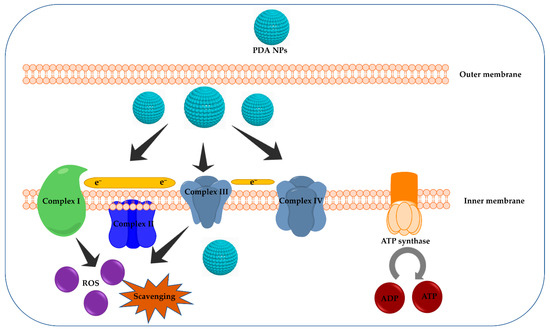 CuCl2 was successfully anchored on PDA-coated magnetic NPs (Fe3O4@PDA-CuCl2), which displayed a uniform and well-dispersed quasi-spherical shape with a mean diameter of 10–20 ± 5 nm [138]. Successful coordination of Cu species on Fe3O4@PDA surface was confirmed using energy-dispersive X-ray (EDX)-coupled with FESEM, which revealed the presence of elemental peaks of Fe, C, N, O, and Cu. Additionally, TEM images showed the successful coating of dark Fe3O4 cores with the grey PDA/CuCl2 shells. The DPPH radical scavenging activity of the prepared PDA-based nanocomposite was close to that of butylated hydroxytoluene. The development of osteoarthritis has been related to excessive ROS production as a result of mitochondrial dysfunction [139]. In another study, uniform and non-agglomerated PDA nanospheres (117.7 nm) acted as dual-task platforms for the treatment of osteoarthritis by scavenging ROS and regulating cellular powerhouses (Figure 7) [140]. Zeta potential measurements revealed that the NPs were negatively charged (−39.8 mV), which could be ascribed to the abundance of catechol functional groups on the surface of PDA NPs. ROS scavenging activity of PDA NPs was assessed against 1O2, •OH, H2O2, and O2•. A dramatic reduction in ROS levels occurred in presence of different concentrations of PDA NPs. The 1O2, •OH, H2O2, and O2•− were eliminated using 200 μg/mL of Fe3O4@PDA-CuCl2 with percentages of 66.6%, 71.1%, 76.1%, and 83.9%, respectively, indicating the remarkable scavenging potential and the efficient removal of ROS in aqueous solutions. Furthermore, the intracellular ROS-scavenging potential of PDA NPs was further assessed using DCFHDA and MitoSOX (i.e., mitochondria-specific ROS probe). After incubation with PDA NPs for 24 h, the ROS levels significantly decreased in a PDA concentration-dependent manner. Generally, nutritional molecules are converted to ATP in mitochondria via mitochondrial oxidative phosphorylation (OXPHOS). Mitochondria, cellular powerhouses, are considered significant cellular compartments for ROS production [141]. ROS are generated through the ETC as byproducts of oxidative metabolism. ETC is found in the inner mitochondrial membrane and is comprised of four protein complexes (i.e., Complex I, II, III, and IV) that mediate electron transport and ATP synthesis. To investigate the effect of PDA NPs on mitochondrial functionality, ATP levels were measured in LPS-treated chondrocytes in the presence and absence of PDA NPs. A significant increase in ATP levels was noticed in chondrocytes incubated with LPS-PDA NPs. PDA NPs reversed the decrease in OXPHOS efficiency by boosting the efficiency of Complexes II, III, and IV in the ETC, hence improving mitochondrial function and decreasing mitochondrial ROS production [140].