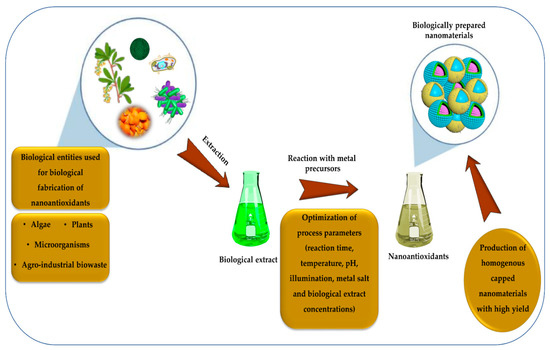 A schematic representation showing the biological fabrication of nanoantioxidants using different biological entities.