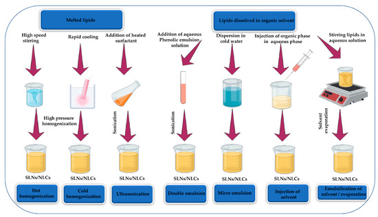 The structural configuration of solid lipid nanoparticles (SLNs) and nanostructured lipid carriers (NLCs), as well as their distinguishing features, make them preferable for delivering sensitive bioactive molecules while avoiding chemical degradation. SLNs were first introduced in 1991 as a revolutionary strategy to resolve the various drawbacks associated with other encapsulation methods [208]. SLNs are composed of lipids that remain solid at both the room and human body temperatures, making them extremely useful when it comes to achieving controlled drug release and for the development of new formulations [209]. Moreover, the size of SLNs ranges between 40 and 1000 nm, allowing for a broader range of NPs and bioactive compounds to be encapsulated based on specific requirements [210]. SLNs possess various advantages compared to other colloidal systems, involving high stability, biodegradability, lack of toxicity, the possibility of up-scale production, and the ability of lyophilization, and incorporation of hydrophilic and lipophilic drugs [211]. However, some limitations are associated with SLNs, such as a relatively high water content (i.e., 70%–99.9%), which may represent a major issue during incorporation into a final product [212]. Furthermore, due to the tendency of lipid crystals to recrystallize over time, loading efficiency can decrease. Nanostructured lipid carriers (NLCs) are a new generation of lipid NPs that are made up of both solid and liquid lipids in ratios ranging from 70:30 to 99.9:0.1 [210]. When using liquid lipids, the melting point is reduced, which improves some of the intrinsic properties such as reduced drug release during storage and improved loading potential [213]. However, it is important to note that drug localization in the SLNs/NLCs is also affected by lipophilicity and the structure of the target molecule [214]. For the aforementioned reasons, NLCs are an interesting option for preserving antioxidant molecules while controlling their release rates. Several studies have shown that some antioxidants, such as lycopene [215], quercetin [216], curcumin [217], and astaxanthin [218] can be successfully loaded onto NLCs. Other studies revealed the successful encapsulation of resveratrol [219], idebenone [220], ferulic acid [221], and curcumin [222] on SLNs. Some of the most common techniques applied for the synthesis of SLNs and NLCs are presented in Figure 9 [209].