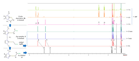 3.4.3. Search for the Thiiranium Intermediate 5 in the Reaction of 2-[(Chloroethyl)thio]-1-methyl-1H-imidazole 3 with Silver Tetrafluoroborate in DMSO-d6