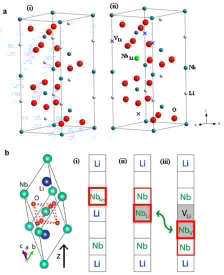Crystal structure of LiNbO3 can be described as hexagonal unit cells (Figure 2a) or rhombohedral unit cells [16,17]. In stoichiometric LiNbO3, along c row direction, the O octahedral interstitials are filled by Li ions (one-third), Nb ions (one-third), and empty (one-third), forming –Li–Nb–▯–Li–Nb– sequence [18,19,20]. Much experimental and simulation effort have been made in the past in order to understand the defect structure in LN crystal [8]. Several defect models have been constructed—i.e., oxygen vacancy model, niobium vacancy model ([Li1−5xNb5x][Nb1−4xV4x]O3), and lithium vacancy model ([Li1−5xV4xNbx]NbO3) [18,19,20]. Congruent LiNbO3 crystals were grown with LiCO3 and Nb2O5 as starting materials, which contain a high concentration of Nb anti-sites (NbLi4+) and Li vacancies (VLi−) (Figure 2a(ii)) [21]. Owing to atomic radius differences between Nb and Li, it forbids Li replacement in a Nb site. Thus, the composition deviates from stoichiometric only toward the Nb-rich side [22,23]. The Li vacancy model is mostly accepted nowadays thanks to a great number of investigations, some of them very important and performed in the 1990s. This is given in detail in [8]. Since these defects are charged, further defects with counter charges are required in order to guarantee overall charge neutrality [23]. Thus, for energetic reasons, complex ionic complexes and spaced clusters are present as shown in Figure 2b [17]. However, debate still prevails on the available models on defect clusters. The understanding and control of LiNbO3 intrinsic and extrinsic defects during crystallization and operational process is important for specific applications.