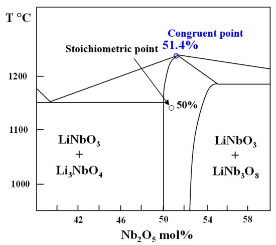According to binary phase diagram, LiNbO3 has a large solid solution range, which can exist and be stable on Li composition from 46.5 mol% to 50 mol% (Figure 3). The liquid–solid curve reveals a diffuse maximum at approximately 48.6% Li2O [24]. With exceeding composition range, the secondary LiNb3O8 and Li3NbO4 phases can be created. The binary phase diagram can be determined by measuring XRD of different samples along solid lines. However, it is also needed to probe precise composition range, because LiNbO3’s bulk properties are composition dependent [25].