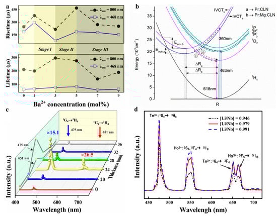 (a) The dependence of lifetime and rise time upon Ba2+ concentration with 468 and 800 nm [41]; (b) The configurational coordinate diagram of Pr3+:CLN and Pr3+/Mg2+:CLN, depicting the light emitting mechanism based on the intervalence charge transfer [42]; (c) The UC spectra of Au-coated Tm3+/Yb3+/LN wafers in different film thickness [43]; (d) Upconversion emission spectra of Ho3+/Yb3+/Tm3+:LiNbO3 single crystals with different [Li]/[Nb] ratios ([Li]/[Nb] = 0.946, 0.979 and 0.991) under 980 nm excitation at room temperature [44].