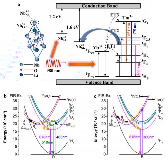 (a) The energy level diagram illustrating the luminescence mechanism in Tm3+, Yb3+: LiNbO3 under 980 nm excitation [45]. Schematic configurational coordinate diagrams for the FIR-Ex strategy in Pr:CLN with (b) 463 nm excitation and (c) 360 nm excitation [46].