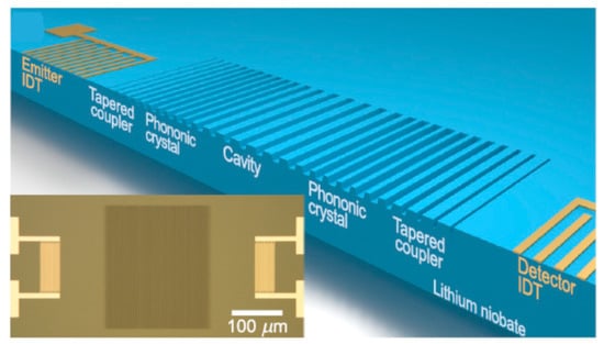 LiNbO3 SAW devices also have found their usage in solid state physics, for example, SAW-driven quantized charge transport [53,54], the use of SAWs to control phonon angular momentum [55], the strong optomechanical coupling of individual quantum emitters and a surface acoustic wave [56], and quantum control of surface acoustic-wave phonons [57]. In integrated photonic systems, LiNbO3 SAW resonators can be used to confine surface phonons [58]. At GHz frequencies, it is difficult to achieve SAW resonators with a high Q factor and small phonon mode size. Based on Y128° cut LiNbO3 crystal, a compact high-Q (6 × 104 at 4 Kelvin) SAW resonators with mode size as low as 1.87 λ2 operating at GHz frequencies have been designed (Figure 6) [59]. The f·Q value (>1013) and small mode size SAW resonators can be applied in quantum photonics and integrated hybrid systems with phonons, photons, and solid-state qubits. In these applications, LiNbO3 SAW were often coupled to other physics system, which demand smart-cut LiNbO3 thin film. In future, crystal processing (smart-cut + polishing and wafer bonding) and nanofabrication of LiNbO3 single crystal will more and more important in this field.