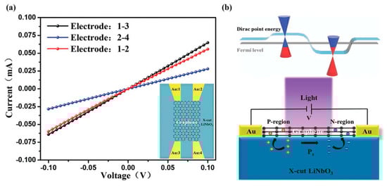 LiNbO3 has the advantages of spontaneous ferroelectric polarization, high dielectric constant, high chemical stability, and high voltage electric coefficient, which can be served as substrate to improve photodetector, catalysis, photoreactivity, and battery performances of other materials [60,61]. LiNbO3 polarized doping has been used to enhance the photoelectric detection characteristics of graphene [62]. As shown in Figure 7, the devices were fabricated with graphene deposited on x-cut LiNbO3 bulk and film crystals. The local ferroelectric polarization of x-cut LiNbO3 leads to the formation of n- and p-doping of graphene at the same time. This p–n junction photodetector shows a wide detection range of 405 to 2000 nm, a responsivity of ≈2.92 × 106 A/W at an incident power of 24 pW (λ = 1064 nm), a high detectivity of ≈8.65 × 1014 Jones, and a fast rise/decay time of ≈23 ms/≈23 ms. The oxygen reduction reaction (ORR) is a key reaction for fuel cell, biological electrocatalysis, and air-batteries [63]. It is difficult to achieve ORR reaction at the standard potential of 1.23 V vs. NHE. A piezoelectric electroanalytical platform for modulating ORR reactivity has been formed with a thin layer of Pt deposited on LiNbO3 single crystal substrate (Figure 8) [64]. Piezoelectric actuation caused up to a ∼10 mV positive shift for the ORR reduction wave, when compared to curves in the absence of actuation.