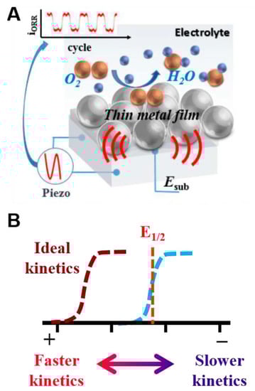 Action of a piezoelectric substrate on the reactivity of the ORR on platinum. (A) Piezoelectric control of platinum strain determines oxygen reduction reactivity. (B) Theoretical steady state voltammetric response of the ORR when changing the reaction kinetics with piezoelectric actuation. Shifts toward more positive potentials indicate increased kinetics, while shifts toward negative potentials indicate more decreased kinetics. The ideal ORR wave would have its half-wave potential at 1.23 V vs. NHE [64].