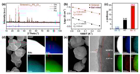Characterizations of LiNbO3-coated LiNi0.7Co0.1Mn0.2O2 (LNO@NCM712) [70]. (a) XRD Rietveld refinement of the prepared Li 5.5 PS 4.5 Cl 1.5. (b) Arrhenius plots of the Li 5.5 PS 4.5 Cl 1.5 electrolytes obtained from milling and annealing processes. (c) The ionic conductivities of the annealed Li 5.5 PS 4.5 Cl 1.5 electrolyte at different temperatures (−20 °C, RT, and 60 °C). SEM/TEM images and the corresponding EDX mapping results of (d) the pristine NCM712 and (e) LNO@NCM712.