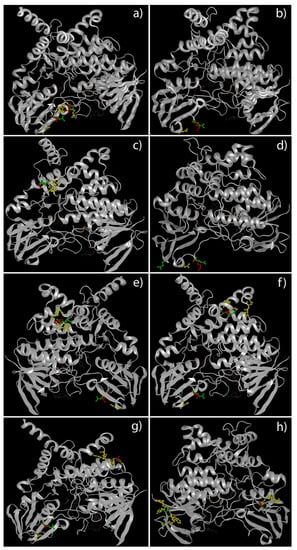 In detail, the AutoDock Vina Extended permitted a highly accurate docking between ligand and enzyme, reducing computation time with a multithreaded algorithm, and mixing a “physical” scoring with a machine learning one. The analyses were performed setting minimization to 5000 steps and docking exhaustiveness to 8. The analyses calculated a total of 10 modes with affinity (kcal/mol), Ki (µmol), and RMSD lower and upper bound (A).