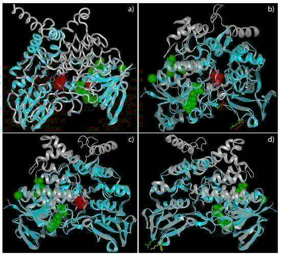 3D structural models of FMO3 proteins in patients carrying non-sense variants. This panel highlights the predicted tertiary structure of FMO3 in patients 1 (Y331Stop) (a), 2 (P153L, E158K and P380fs) (b), 3 (P380fs) (c), and 4 (E308G and P380fs) (d). The grey tube/ribbons represent the wild-type structures, while the light blue the over imposed mutated ones. The green spheres represent the predicted ligands/coenzymes/cofactors exclusive of wild-type FMO3 (ADP, Na, and TMA), while the red spheres the predicted ones exclusive of different truncated FMO3 (Indole, Mg, and TMA; exceptions are represented by patient 3, who does not present the Mg, and by patient 4, who does not present any exclusive ligand compared to wild-type form of FMO3). Lateral chains of amino acids involved in missense variants are represented in green for the wild-type allele and in red for the mutated one. Yellow chains are characteristics of amino acids nearest to mutated ones.
