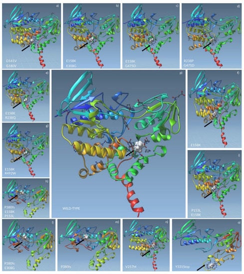 The situation resulted completely different for FMO3 carrying Y331stop and P380Fs variants in haplotypes (P380Fs + E308G and P380Fs + P153L + E158K, respectively). It is already known from the literature that both variants lead to a truncated protein whose enzymatic activity is reduced or totally absent, depending on whether this variant is in a heterozygous or a homozygous condition []. However, the molecular mechanisms underlying this deficit are not yet fully known. As shown in Figure 2, the stop variants resulted in the loss of the binding site for the FAD prosthetic group, therefore blocking the TMA oxidation process.