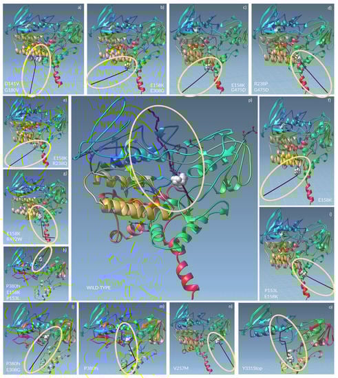The physicochemical properties of each mutated FMO3 protein computed by ProtParam are shown in Table 2. The molecular weight ranged from 36,917 g/mol of Y331Stop to 60,090 g/mol of E158K_G475D. Theoretical isoelectric points (pI) for these proteins ranged from 6.26 of Y331Stop to 8.47 of E158K_E308G. The theoretical pI represents the pH at which a particular molecule or surface carries no net electrical charge, and it could help to understand the protein charge stability []. The mutated FMO3 proteins of this study had GRAVY indexes ranging from −0.06 of D141V_G180V to −0.21 of Y331Stop. The GRAVY value for a peptide or protein is calculated as the sum of hydropathy values of all of the amino acids, divided by the number of residues in the sequence []. Thus, these low GRAVY ranges indicate the possibility of being a globular (hydrophilic) protein rather than membranous (hydrophobic). This information might be useful for localizing these proteins. The aliphatic index for all FMO3 proteins involved in this study ranged from 73.21 of Y331Stop to 83.16 of D141V_G180V. A high aliphatic index indicates that a protein is thermo-stable over a wide temperature range []. The aliphatic index of a protein is defined as the relative volume occupied by aliphatic side chains (alanine (Ala), valine (Val), isoleucine (Ile), and leucine (Leu)). It may be regarded as a positive factor for the increase in thermo-stability of globular proteins []. All proteins were stable (a protein whose instability index is <40 is predicted as stable []), with the instability index values for our hypothetical and conserved proteins range from 33.02 of Y331Stop to 35.12 of V267M. Further details on biochemical properties of wild-type and mutated FMO3 proteins are available in Table S1.
