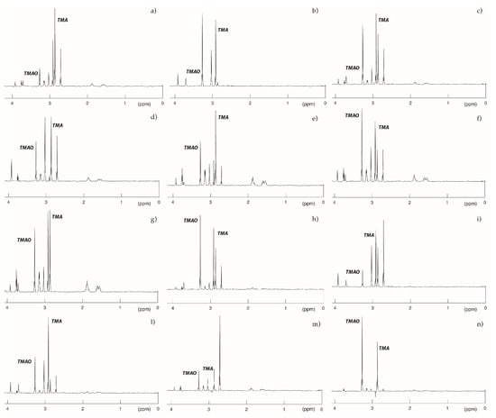 The TMA peak at 2.92 ppm was much more intense in the urine samples from patients 1 (Figure 5a), 2 (Figure 5i), and 4 (Figure 5l), whose FMO3 genotype was characterized by nonsense variants. Conversely, patients 6 (Figure 5f), 7 (Figure 5n), 8 (Figure 5h), and 10 (Figure 5b) showed a higher peak for TMAO, suggesting that FMO3 variants carried by these subjects might only slightly alter the catalytic activity of the enzyme.