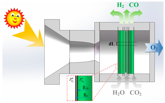 A conceptual solar thermochemical OPM reactor is illustrated in Figure 1, in which a bundle of OPM tubes made of dense MIEC ceramic material is exposed to concentrated sunlight that heats the reactor to a temperature sufficiently high for both noticeable partial thermolysis of water or carbon dioxide and oxygen transport across the membrane. Point-focusing solar collector, (e.g., parabolic dish collector capable of reaching 1527 °C [3]), can be used for converting solar energy into thermal energy to drive the endothermic chemical reaction.