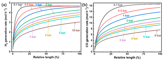 (a) H2 and (b) CO generation rate versus the relative length of the reactor.