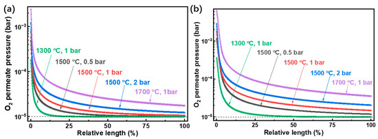 In Figure 6, the O2 partial pressure under equilibrium conditions in H2O (Figure 6a) and CO2 (Figure 6b) splitting reactions are given. Due to the difference in equilibrium constants of H2O and CO2 splitting as analyzed above, the O2 partial pressure in CO2 splitting is higher than that in H2O splitting under the same conditions. Also, higher temperatures and reaction pressures require longer tube lengths to achieve equilibrium conditions, where the O2 partial pressure equals the permeate pressure (10−5 bar).