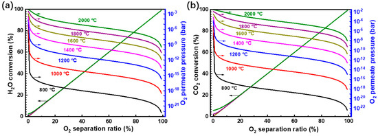 To further analyze the thermodynamic performance of the system, the reaction temperature is extended from 800 °C to 2000 °C, which can be achieved by concentrated solar energy [41,42] and covers the common temperature range for high-temperature solar thermochemical reactions. The conversion and required O2 permeate pressure are exhibited in Figure 8. In Figure 8, the O2 separation ratio is defined as the ratio of the molar amount of O2 separated to half of the H2O fed into the reactor (the theoretical maximum O2 amount that can be separated). As the O2 separation ratio increases, the required O2 permeate pressure decreases and the conversions of both H2O and CO2 are enhanced. The O2 separation ratio has an almost linear relationship to H2O or CO2 conversion as the product generation amount is nearly twice that of the O2 separation amount, except for the simultaneous reaction at high temperature (e.g., 2000 °C) and low O2 separation ratio. Both high temperature and low permeate pressure are beneficial to high conversion rate, but the resultant increased requirement in energy to preheat the reactant and separate the O2 has a negative influence on the thermodynamic efficiency.