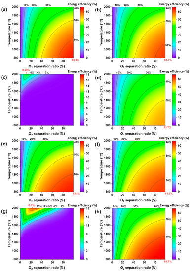 To further analyze the thermodynamic efficiency, the first-law thermodynamic efficiency with separation exergy, electrochemical O2 pump, and vacuum pump for O2 separation and the second-law thermodynamic efficiency are calculated and given in Figure 9. The first-law thermodynamic efficiency with separation exergy (Figure 9a,e), 80% separation efficiency (electrochemical O2 pump in Figure 9b,f), separation efficiency using Equation (10) (vacuum pump in Figure 9c,g), and the second-law thermodynamic efficiency (Figure 9d,h) of H2O and CO2 splitting are given for a temperature range of 800 °C to 2000 °C. Except Figure 9c,g, the other figures show an optimum efficiency at 800 °C with the highest O2 separation ratio (99%), mainly due to less radiation loss in low temperature and more fuel generation with a high O2 separation ratio. The optimum first-law thermodynamic efficiency is 63.8% and 63.6% for H2O splitting and CO2 splitting with separation exergy (Figure 9a,e), which denotes the upper bound of the first-law thermodynamic efficiency. The electrochemical O2 pump is driven by an electric potential difference between the two sides of the membrane, which has high energy efficiency. Based on an assumption of 80% separation efficiency, the optimum first-law thermodynamic efficiency is 61.7% and 61.5% for H2O splitting and CO2 splitting (Figure 9b,f). The energy efficiency of H2O splitting is slightly higher than that of CO2 splitting because the equilibrium constant of H2O splitting (6.53 × 10−10) is slightly higher than that of CO2 splitting (6.16 × 10−10) at 800 °C. This results in slightly higher conversion rates of H2O splitting compared to that of CO2 splitting.
