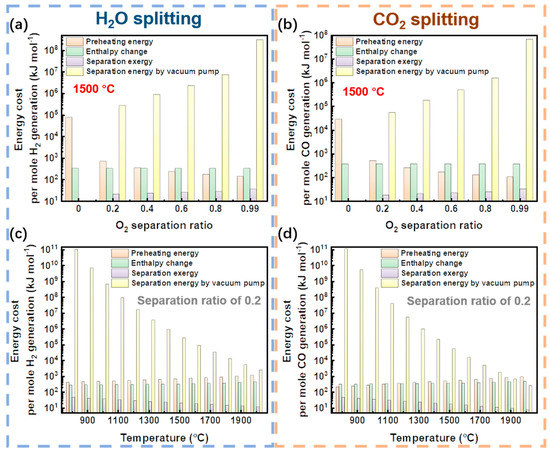 Energy cost per mole fuel generation in high-temperature solar thermochemical H2O or CO2 splitting reaction. (a,b) Energy cost versus O2 separation ratio; (c,d) Energy cost versus reaction temperature. (a,b) are at the reaction temperature of 1500 °C, and (c,d) are with the O2 separation ratio of 0.2. The thermal energy (preheating energy and enthalpy change) cost contains absorption efficiency (radiation loss and optical loss) given in Equation (7).