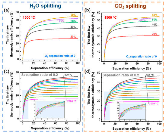 In Figure 10c,d, the energy cost versus reaction temperature with an O2 separation ratio of 0.2 is given. With increasing temperature, the radiation loss is increased and more preheating energy is required to maintain the same conversion rate (Figure 8a). As the permeate pressure declines, the separation energy increases due to the increased energy requirement of the separation method (herein the vacuum pump energy). In all cases, the enthalpy changes per mole fuel generated are almost constant, which only slightly varies with temperature. Thus, separation energy is the key parameter to influence the final energy efficiency. Although not discussed here, the energy cost for the second-law thermodynamic efficiency is similar to that of the first-law thermodynamic efficiency. To further demonstrate the significance of O2 separation efficiency, the influence of separation efficiency on the first-law thermodynamic efficiency of H2O and CO2 splitting is calculated in Figure 11.