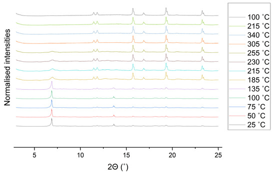 The water loss and first degradation step at 300 °C were explored further by use of variable temperature X-ray diffraction (VTXRD) (Figure 9). The VTXRD indicates the MOF is stable up to 100 °C, and that at 135 °C the pattern shows a subtle broadening indicating the start of a change in the structure, likely due to water loss. At 185 °C the pattern changes significantly: the major peak at 6.87° shifts to 6.95° and becomes much broader, the sharp peak at 13.62° is replaced by three broad peaks between 12.27 and 14.44°. This suggests that loss of water induces a change in the crystal structure, although the broadening of the peaks also suggests a reduction in crystallinity. Above 305 °C the only Bragg diffraction peaks visible come from the corundum sample holder indicating that the MOF has become amorphous, which shows that this peak in the DTA is destruction of the MOF. On cooling this amorphous structure remains. These results were confirmed by ex situ heat treatment and analysis (Figure S3).