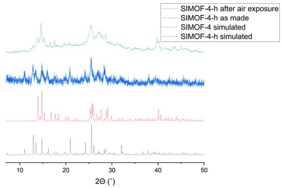 Simulated PXRD patterns of SIMOF-4 and SIMOF-4-h (high T form) and experimental patterns of SIMOF-4-h as synthesized and after prolonged exposure to air. All patterns obtained at room temperature.