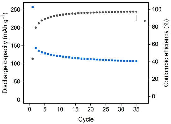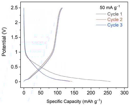 Subsequently, galvanostatic charge/discharge cycling was carried out at a current density of 50 mA g−1 (Figure 12 and Figure 13). A high capacity of ~257 mAh g−1 was observed for the first discharge with a low coulombic efficiency (43%). This could be indicative of the contribution of SEI (solid-electrolyte interphase) layer formation [37] and changes to the structure or amorphization as anticipated from CV profiles. The load curves did not show long voltage plateaus and exhibited overlapping traces from the 3rd cycle onwards (Figure 12). The discharge capacity reduced to 144 mAh g−1 in the second cycle and had only a gradual fade and stabilised at ~110–120 mAh g−1 in the following cycles (Figure 13). This is a moderate discharge capacity [38] but one that does suggest some promise for this type of material.