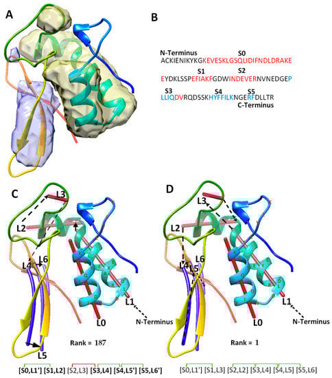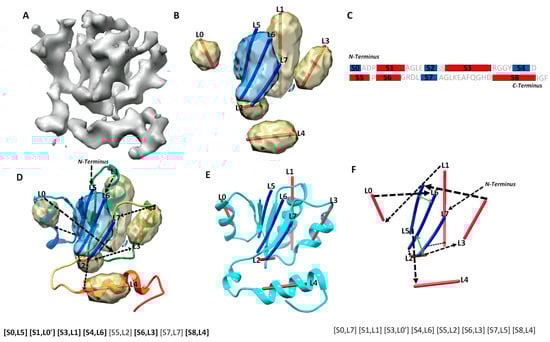Protein secondary structures, such as α-helices and β-sheets, are the most distinguishable characteristics in a medium-resolution cryo-EM density map, even though amino acids are not discernible at such a resolution. In most medium-resolution maps, an α-helix resembles a cylinder, and a β-sheet appears as a thin layer of density in a medium-resolution map, although the general shape characters may be affected by their sizes and the density from local environment of the molecule. As an example, five helix regions and one β-sheet region were identified using DeepSSETracer, a secondary structure detection method built on convolutional neural networks (CNN) [20] (Figure 1B). A segmented helix region is represented by the central line (also referred as α-trace) using Principle Component Analysis. A segmented β-sheet region can be represented using a set of lines (also referred as β-traces) for β-strands using StrandTwister [21]. StrandTwister utilizes the twist of a β-sheet to derive possible orientations of β-strands from a segmented β-sheet region. In principle, it is possible to use a set of lines to represent the orientation and position of major helices and β-strands in the cryo-EM density map of them medium resolution.Various methods have been developed to detect secondary structure elements such as α-helices and β-sheets from cryo-EM density maps [22,23,24,25,26,27,28,29]. In practice, accurate detection of secondary structure is challenging, since the detection may miss or wrongly detect a helix/β-strand. As an example, eight secondary structure traces were detected, labeled from L0 to L7, from the cryo-EM density map (Figure 1B,D). Four of the five helices are correctly detected, since they are in the proximity of the helices in the atomic structure. L2 was a wrongly detected small helix region at a turn of the atomic structure. Three β-strands in the β-sheet (blue) were detected, and two of them, L5, and L6, are close to the two strands in the atomic structure (Figure 1D). The third detected β-trace, L7, corresponds to a loop in the atomic structure 5y5x (PDB ID). In general, secondary structure traces show relative geometric relationship among secondary structures, although such information needs to be linked with the sequence of amino acids to derive the tertiary structure of a protein.