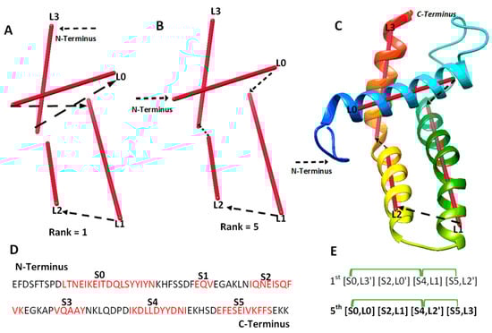 Mapping secondary structure traces predicted from a cryo-EM 3D image to segments of amino acid sequence is referred to as the process of finding the topology of secondary structures [15,16,17]. The problem of finding the optimal secondary structure topology is an NP-hard problem [13], although the number of secondary structures is bounded. Let us use a simplified example, in which only helices are in the structure, in order to consider the nature of the problem. Suppose N α-traces are detected from a cryo-EM density map, and M helix segments are predicted from the protein sequence, M ≥ N. A topology of helices describes the order of the N helix traces and the direction of each trace with respect to the direction of the protein sequence. In total, there are topologies for helices. This is because there are ways to pick N from M secondary structures, and for each set of N traces, there are different orders and two possible directions for each trace. For a protein with both helices and β-strands, sequence segments and traces are matched separately for helices and β-strands, respectively. For an example, in the topology in Figure 1D, the order of the eight detected secondary structure traces is (L5, L0, L1, L6, L2, L3, L7, L4) starting from N-terminal to C-terminal of the sequence. Suppose we use L5 and L5′ to distinguish two possible directions to align trace L5 with the protein sequence and do similarly for other traces. The above-mentioned topology is represented as a list ([S0, L5], [S1, L0′], [S3, L1], [S4, L6], [S5, L2], [S6, L3], [S7, L7], [S8, L4]), in which the order is reflected by matching each trace to a specific sequence segment from N to C terminal. In this topology, all six correctly detected secondary structure traces are mapped to sequence segments at approximately correct locations on the sequence, represented as ([S0, L5], [S1, L0′], [S3, L1], [S4, L6], [S6, L3], [S8, L4]) (highlighted in Figure 1D). An example of an incorrect topology is shown in Figure 1F, with an incorrect order of the six correctly detected traces, as in (L1, L0, L6, L3, L5, L4).