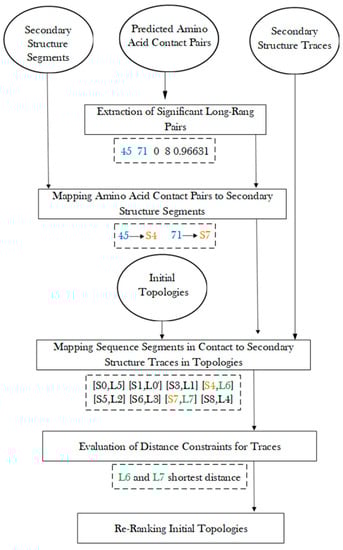 One of the purposes of this study is to investigate the effectiveness of amino acid contact pair information for topology determination. The aim is to enrich the ranking of those initial topologies that satisfy the contact distances at the secondary structure level. The assumption is that when two amino acids are in contact, those belonging to two secondary structures require the pair of secondary structures to be close. Since each initial topology matches predicted sequence segments to traces, the pair of traces with the pair of amino acids could be evaluated for their distance in three-dimensional space. Those topologies with more pairs of secondary structure pairs satisfying distance constraints are re-ranked higher. A re-ranking score (see Section 3.5) was used to consider both the initial topology score and the satisfactory of contact pairs, so that it is less affected by the error from either side of the evaluation.