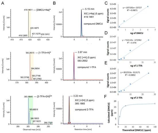 Quantification of water solubility of DMCU, 1-TFA, and 2-TFA. (A,B) Mass spectrum (A) and extracted ion chromatograms (XIC) (B) of DMCU, 1-TFA, and 2-TFA. (C–E) Calibration curves of DMCU (C), 1-TFA (D), and 2-TFA (E). (F) An investigation on the water solubility of DMCU. The solubility of all compounds was determined at room temperature.