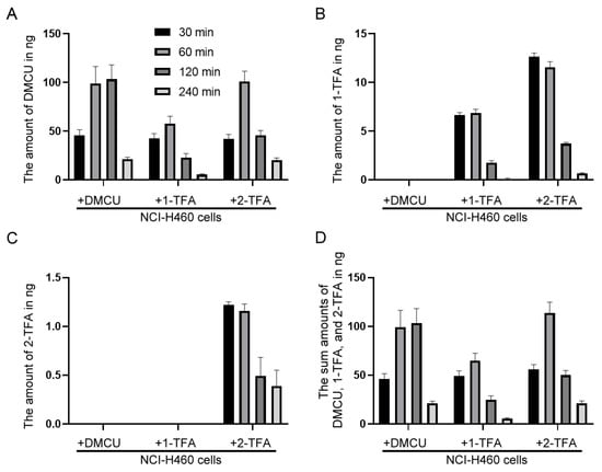The intracellular levels of DMCU, 1-TFA and 2-TFA in the NCI-H460 cells. The cellular extracts were obtained from DMCU, 1-TFA, or 2-TFA treated cells at the indicated time intervals. The amount of drug uptake, (A) DMCU, (B) 1-TFA, (C) 2-TFA, or (D) sum amounts of DMCU, 1-TFA, and 2-TFA, was evaluated in the cellular extracts of approximately 1 × 106 cells by LC-MS analysis. Data are presented as mean and SD from three experiments.
