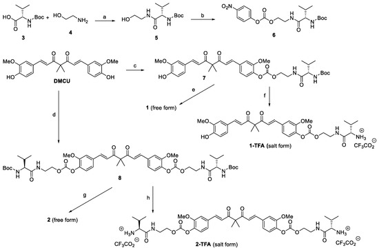 DMCU with a direct linkage of BCAA to sterically congested phenol group may restrict the close proximity of LAT1 and lower down the enzyme recognition. We anticipated that the introduction of a self-immolating linker between the phenol group and BCAA can tackle the above problem [24]. In the regard, the target derivative 1 was prepared through the addition of a two-carbon side chain to the DMCU phenol group via the connection of a carbonate functionality (Figure 1). The N-terminus of the two-carbon side chain was linked to a BCAA by an amide bonding. We selected L-valine as the BCAA source since the previous metabolomic analysis indicated that L-valine was increased in the tumors of NSCLS patients, implying NSCLCs prefer to acquire L-valine [25]. To improve LAT recognition, compound 2 was designed as a di-substituted derivative incorporating the ethylene-carbonate-linked L-valine chains on both of the DMCU phenol groups.
