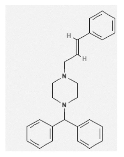Cinnarizine (CNZ) (Figure 1, IUPAC name: 1-benzhydryl-4-[(E)-3-phenylprop-2-enyl]piperazine, CAS number: 298-57-7, PubChem CID: 1547484, molecular formula: C26H28N2, and molar mass: 368.50 g mol−1) appears as a white crystalline powder [,]. It is used as an antihistaminic and blood-flow promoter [,]. The biopharmaceutical classification system (BCS) classifies it as a BCS class II drug, meaning it has poor aqueous solubility and high permeability [,]. It is a weak base, which is practically insoluble in water with a high partition coefficient value (log P = 5.8) []. Hence, the bioavailability and oral absorption of CNZ are limited by its low solubility and poor dissolution rate []. CNZ is a non-efficient drug molecule due to its low solubility, stability, and poor bioavailability from a physicochemical viewpoint [,,,,]. Various lipid-based drug delivery systems, such as self-nanoemulsifying drug delivery systems (SNEDDS) and solidified SNEDDS, have been developed to modify the physicochemical characteristics of CNZ [,,,,,,,,,].