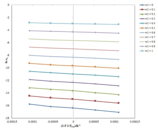 where x1,T and x2,T are the solubility of CNZ in TP (1) and water (2) at temperature T, and the symbols J are the model parameters. The solubility values of CNZ in pure solvents are required as input data to predict the solubility of CNZ in cosolvent compositions at the temperature of interest. To overcome this constraint, Equations (2) and (6) can be combined to form the “Jouyban–Acree–van’t Hoff model” [].
