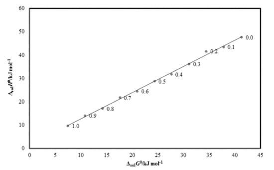 An enthalpy–entropy compensation analysis was used to analyze the solvation behavior of CNZ (3) in binary {TP (1) + water (2)} combinations, as previously proposed []. This analysis was carried out by plotting the weighted graphs of ΔsolnH° vs. ΔsolnG° at Thm = 303.0 K [,].
