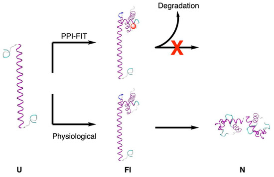 Schematic representation of the PPI-FIT approach to protein regulation. U = unfolded; FI = folding intermediate; N = native. The red sphere represents the drug molecule.