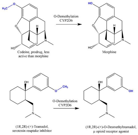 CYP2D6-mediated O-dealkylation of morphine 3-methoxy derivatives, such as codeine, and tramadol, are required to generate the phenolic OH group important for binding to a histidine of the opioid receptor. CYP2D6 is highly polymorphic, and the expression of different variants results in several phenotypes. The implementation of pharmacogenetics-based codeine prescribing that accounts for the CYP2D6 metabolizer status was described in a recent work [77] and is an example of precision medicine. Genome-wide association studies and candidate gene findings suggest that genetic approaches may help in choosing the most appropriate opioid and its dosage, while preventing adverse drug reactions [78].