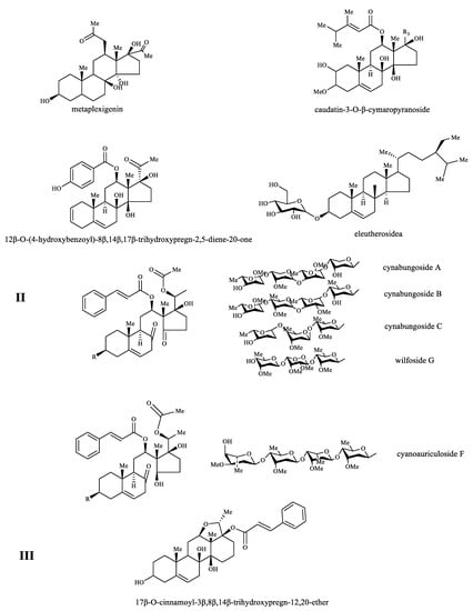 - Huang, L.J.; Wang, B.; Zhang, J.X.; Yan, C.; Mu, S.Z.; Hao, X.J. Studies on cytotoxic pregnane sapogenins from Cynanchum wilfordii. Fitoterapia 2015, 101, 107–116. [Google Scholar] [CrossRef] [PubMed]