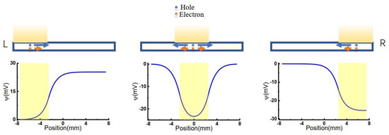 where the subscripts e and h represent electron and hole, respectively. is the local carrier density, is the local electric potential, g is the photoresponsivity, is the incident light intensity at a specific position x, h is the recombination coefficient, D is the carrier’s diffusion coefficient, and is the carrier’s electric mobility.