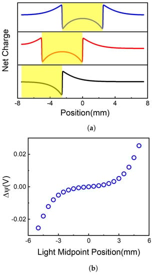 By solving Equation (1) at different initial values of W, the net charge distributions were obtained, as shown in Figure 3a. The centers of illumination are located at and , respectively. It is shown that although the total net charges remain neutral on the 2D membrane, the net charge distributions are highly position-dependent. When the light illuminates on the center of the 2D membrane (), the area of light-illumination has some negative charges, resulting in a sharp increase of positive charges at the edge of light-illumination, i.e., and . The positive charge gradually decays to a minimum at the terminals of the 2D membrane. Because there is symmetric net charge distribution on the 2D membrane, no voltage difference occurs between the two ends of the membrane, as shown in Figure 3b ().