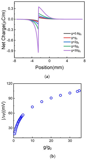 It is shown in Figure 4a that net charges distinctly accumulate at the borderline of illuminate and non-illuminate. The increase of g leads to more net charge accumulation at the borderline. Although the net charge decays gradually along the 2D membrane, the accumulated net charge results in the voltage difference, as shown in Figure 4b. Higher photoresponsivity enriches more net charge accumulation, bringing more significant potential difference. As shown in Figure 4b, the absolute value of voltage difference between two terminals of the 2D membrane increases monotonously with photoresponsivity.