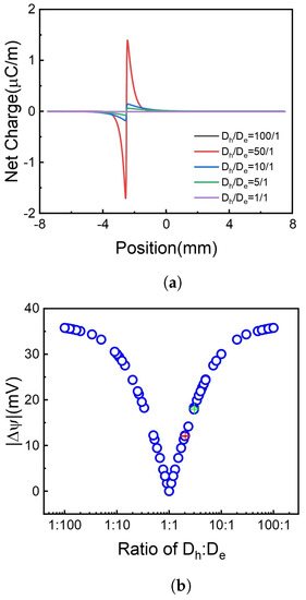 It is shown in Figure 6 that when the divergence of and increases, meaning the diffusion of holes and electrons is more asymmetrical, the voltage difference increases. Furthermore, the rise of voltage difference becomes inconspicuous when the diffusion coefficients become extremely inequality, e.g., or . Compared to the ratio of two diffusion coefficients, the absolute numerical value has little effect on the generation of the voltage difference. Some situations are calculated with the same diffusion coefficient ratio but different values, shown in Figure 6b red and green cross symbols, as a point set which gathers together, e.g., the voltage difference has only a little relation with the diffusion coefficient value.