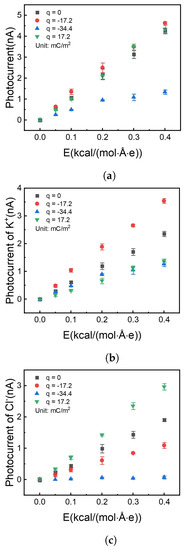 It is shown in Figure 7a that the photocurrent has no apparent difference with surface charge density at 0, , and . But Figure 7b,c show the difference in the contribution of different types of ions to the photocurrent. Firstly, when the surface is not charged (black square symbol), the potassium ion has more current contribution (flux rate) than the chloride ion due to the size-dependent properties. Potassium ion has a smaller diameter, which tends to get through the nanochannel much easier.