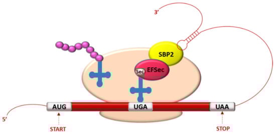 The thyroid is the organ with the highest content of selenium per tissue unit and it accumulates in the selenoproteins where it is present as SeCys [55]. SeCys is encoded by a UGA codon, which is normally considered a stop codon for translation. During protein translation, the signal driving the SeCys insertion is the presence of a stem-loop mRNA structure located in the 3′-untranslated region, called “SeCys insertion sequence” (SECIS) [56]. During the translation, when a ribosome encounters the UGA codon, SECIS element allows the re-coding of UGA as SeCys-specific codon and, in the process, two key factors are involved: the SECIS binding protein 2 (SBP2), which is associated to ribosomes and stably binds the SECIS element, and the SeCys-specific translation elongation factor (eEFSeCys), which interacts with SeCys-tRNA and permits the incorporation of SeCys in the elongating polypeptide (Figure 1) [57].