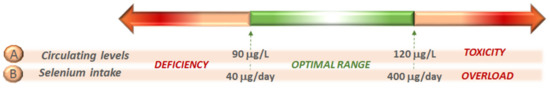 (A) Narrow range of adequate blood Se concentration, levels below and above, risk of deficiency and toxicity, respectively. (B) Recommended daily intake of Se, below and above, risk of adverse effects on health.