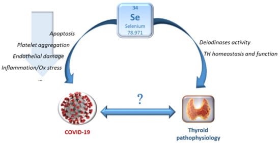 It is known that Se deficiency is associated with greater susceptibility to viral RNA infections and more severe disease outcomes, whereas Se supplementation could benefit antioxidant capacity (GPx and TrxR) and reduce apoptosis, endothelium injury and platelet aggregation [98]. In particular, in this era of pandemic, the relationship between COVID-19 and Se is interesting. Se levels are lower in patients with COVID-19 than in healthy subjects [99,100]. Furthermore, Se deficiency has been associated with the risk of COVID-19 complications and mortality, although the relationship between Se and COVID-19 severity is not definitively demonstrated [101,102,103,104,105,106,107]. Besides, an association between soil Se content and COVID-19 incidence was found in different cities in Hubei Province, as well as an association between soil Se content and the reported outcomes of COVID-19 cases in China [108,109]. A German study suggested that 1.0 mg intravenous Se daily and different combinations of artificial nutrition (containing various amounts of Se and Zn) in critically ill patients with COVID-19-induced acute respiratory distress syndrome may reduce inflammatory biomarkers and improve the immune response [110]. Hence, also in this case, Se supplementation may have important consequences, and monitoring the Se status during the SARS-CoV-2 infection, in both mildly and severely affected patients, and verifying the possible beneficial effects of Se supplementation, can represent a further potential tool both in prevention and as adjuvant therapy for COVID-19. Interestingly, increasing data suggest a bidirectional relationship between COVID-19 and thyroid dysfunction (e.g., through effects on immune system and induction of the cytokine storm by Sars-CoV-2, as well as preliminary findings on adverse effects of preexisting thyroid disease on the prognosis of COVID-19) [111]. In this context, given the possible effect of COVID-19 on thyroid dysfunction and AIT, it will also be interesting to further investigate the association of these conditions with Se deficiency and to evaluate the possible effects of Se in modulating the relationship between SARS-CoV-2 infection and thyroid pathophysiology (Figure 3) [111,112,113,114].