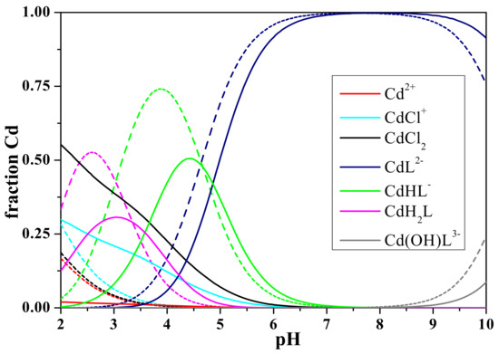 The speciation model reported in Table 6 seems to be the most likely for the system under analysis. Together with these species reported, the possible presence of the M3L species was also tested (log =21.92 ± 0.05 and C03 = 2.33 ± 0.11) but the formation percentage reached was significant (~15%) only in a few titrations with a high CCd:CGLDA ratio to include it in the final speciation scheme. Moreover, limiting the pH to the acidic range (2.0 < pH < 5.0), several minor species were determined. Some examples of possible speciation schemes refined in the mentioned pH range are reported as Supplementary Materials (Table S2) and also contain polynuclear species such as M2H3L, M2H2L2, M2H3L3, M3H2L2, M3H3L3, M3H4L3, M3H2L4 and M4H2L4. Interestingly, the value of the stability constant of the ML species obtained in such trials is always considerably lower than that refined in the selected speciation scheme because the value was refined in a pH range where the formation of this species never reaches the maximum, thus, is underestimated.