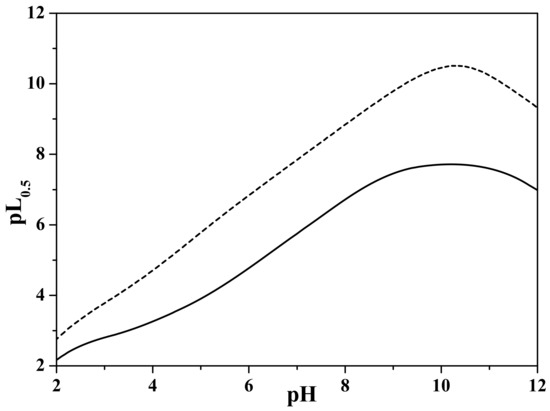 The dependence of pL0.5 of GLDA toward Cd2+ on pH at I = 0.05 (dotted line) and 0.72 (solid line) mol kg−1 is displayed in Figure 3. It can be noted that pL0.5 increases almost linearly with pH at both ionic strength values, inverting the trend at pH ~10 due to the hydrolysis of the Cd2+ cation. Tracing what was found for the formation percentage of complex species noted in Figure 2, complexation is generally greater at low ionic strength values; in terms of pL0.5 it may be noted that values at I = 0.05 mol kg−1 are higher than those at I = 0.72 mol kg−1 by one or two orders of magnitude. In this context, it should be noted that experimental data were analyzed up to pH = 10; no information about further complex species with stoichiometry Mj(OH)2L, whose formation occurs at pH > 10, are available, but their presence seems very unlikely in the case of Cd2+.
