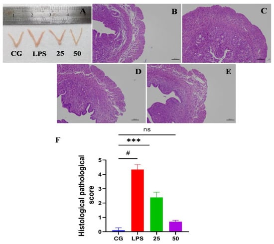 Effects of GnRb1 against LPS-triggered uterine injury. (A) The morphology of uterine tissue. (B) The control group (CG). (C) The LPS group. (D,E) The LPS + GnRb1 (25 and 50 mg/kg, respectively). (F) Histopathological score of uterine sections. The scale bar is of 100 µm (200× magnification). CG represents the control group. LPS reveals the LPS-induced groups. The 25 and 50 are the GnRb1-administrated groups representing 25 mg/kg and 50 mg/kg per animal, respectively. GnRb1 indicates the Ginsenoside Rb1. Data statistics are demonstrated as mean ± S.E.M. The # p < 0.001 CG versus LPS group, *** p < 0.001 and ns indicates the nonsignificant difference between CG versus LPS + GnRb1 groups.
